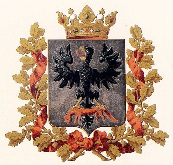 В серебряном щите чёрный орел, держащий в когтях червлёного соболя. Щит увенчан древнею Царскою короною и окружён золотыми дубовыми листьями, соединёнными Александровской лентою[1]