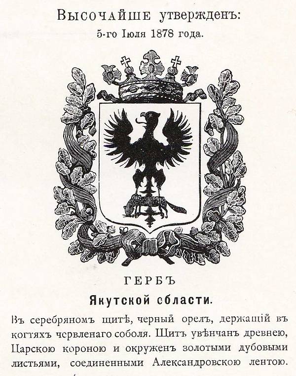 Герб Якутской области Российской империи — первый в истории Якутии — был утверждён императором Александром II 5 июля 1878 года. Официальное описание (блазон) герба выглядело следующим образом: