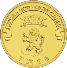 1 сентября 2011 года Банком России была выпущена памятная монета номиналом 10 рублей, из серии «Города воинской славы», на реверсе которой изображён герб Ржева.