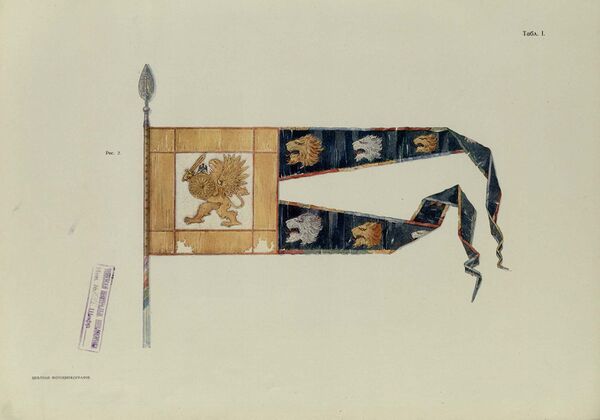 «Прапор середина тафта белая, вшит гриф тафта желтая, с мечом, в левой лапе держит клеймо, повыше клейма писан орлик чёрный, опушка вшита в червчатую тафту, тафта жёлтая. Откоски объярь черная, писаны главы львовы золотом и серебром, опушка тафта разных цветов».
