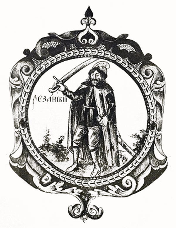 Городъ Рязань имҍетъ старый Гербъ. В золотомъ полҍ стоящій Князь, держащій въ правой рукҍ мечъ, а въ лҍвой ножны, на немъ епанча червленная, а платье и шапка зелёная, обложенная соболями.