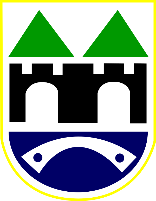 «В верхней части изображены элементы, изображающие типичную крышу и в то же время горы. Средняя часть является символом самого города в лице городской стены и городских ворот. Нижняя часть представляет собой речную долину с мостом, где расположен город».