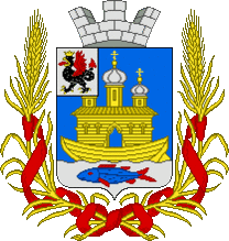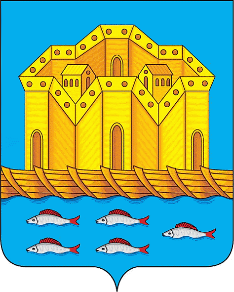 « В голубом поле, город деревянный на судах на реке Волге, и в той реке рыбы. (Старый герб)».