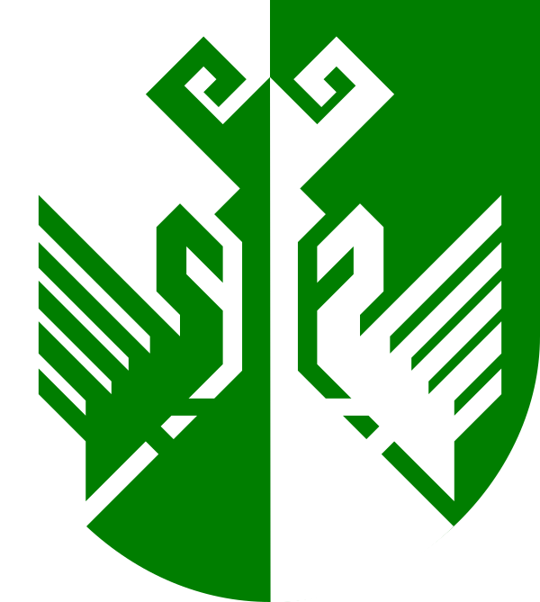 В рассеченном серебром и зеленью поле подобная острию оконечность переменных цветов, сопровождаемая по сторонам двумя сообращенными стоящими птицами с воздетыми крыльями; вершина оконечности заканчивается выступающим вилообразным крестом, в соединении два раза ромбовидно уширенным и с дважды гаммированными вовнутрь штамбовыми плечами.