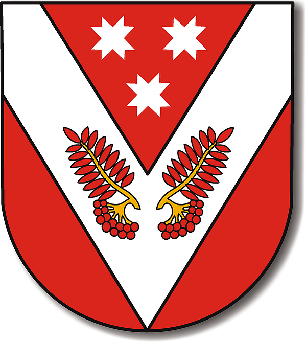 В червленом (красном) поле серебряное опрокинутое стропило, обремененное двумя червлеными кистями рябины с листьями и сопровождаемое во главе тремя серебряными вырубными крестами (два и один).