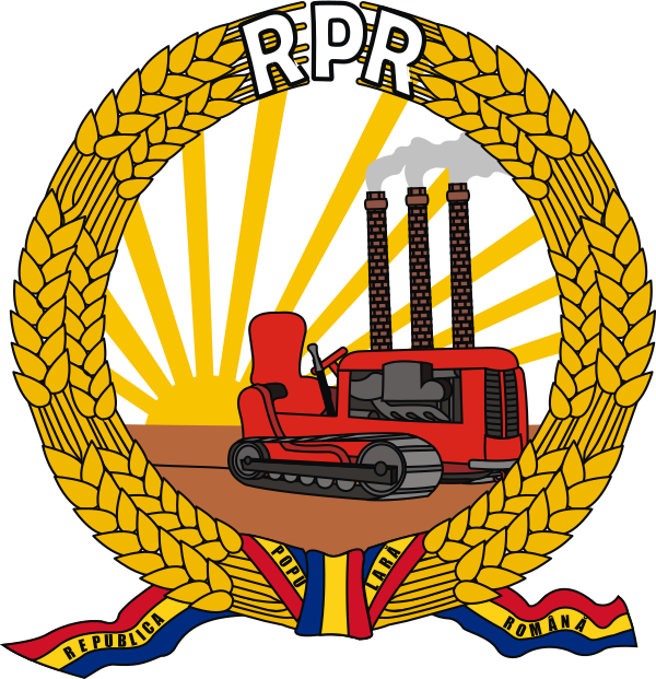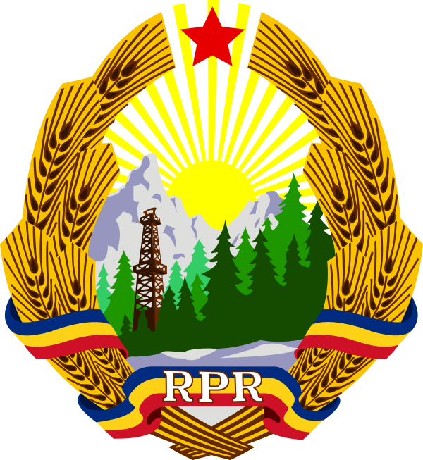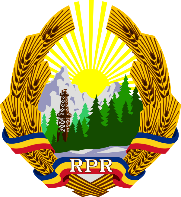 Stema Republicii Populare Române, reprezintă munți împăduriți, deasupra cărora se ridică soarele. În mijloc se află o sondă, iar în jurul stemei o coroană de spice de grâu. |