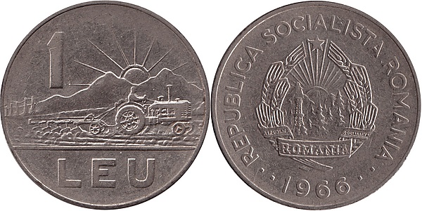 На гербе Румынской Народной Республики изображены заснеженные горы, над которыми поднимается солнце. Посередине расположена нефтяная вышка, герб обрамлён венком из пшеничных колосьев. |
