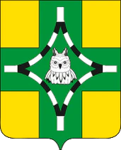 В золотом поле зелёный крест, обременённый составным серебряно-чёрным узким вогнутым сквозным ромбом с усечёнными концами. Внутри ромб сопровождён серебряной головой ушастой совы.
