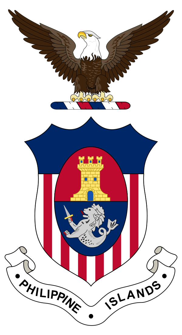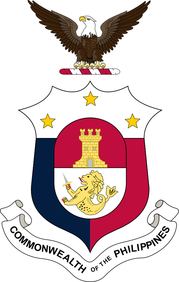 Герб Филиппин был принят в 1940 году. Это щит с солнцем Филиппин посередине, 8 лучей которого представляют 8 областей (Батангас, Булакан, Кавите, Манила, Лагуна, Нуэва Эсиха, Пампанга и Тарлак); тремя пятиконечными звёздами, представляющими три островные группы: Лусон, Висайя и Минданао, составляющими Филиппинский архипелаг. В напоминание о колониальном прошлом Филиппин в синей области герба изображён белоголовый орлан — национальный символ Соединённых Штатов, в красной области справа — восстающий лев — символ былого господства Испании.