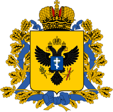 В золотом поле чёрный Византийский, увенчанный двумя золотыми коронами, орёл, с золотыми клювами и когтями и червлёнными языками; на груди в лазуревом, с золотыми краями, щите золотой осьмиконечный крест. Щит увенчан Императорскою короною и окружен золотыми дубовыми листьями, соединенными Андреевскою лентою».