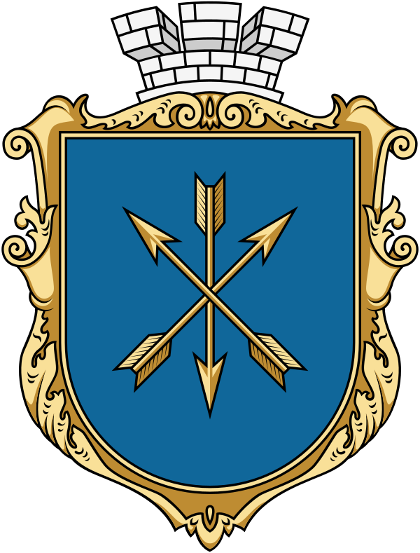 Описание: Фон верхней части щита — желтого цвета. В этой же части был изображён Подольский герб. Нижняя часть герба несколько повторяла элементы всех гербов Хмельницкого: в ней расположены три перекрещенных стрелы, но уже на лазурном поле[4].