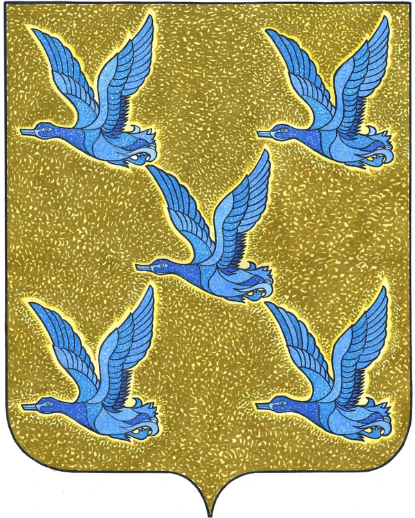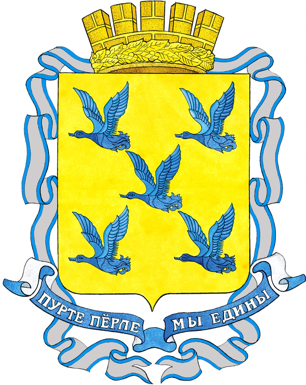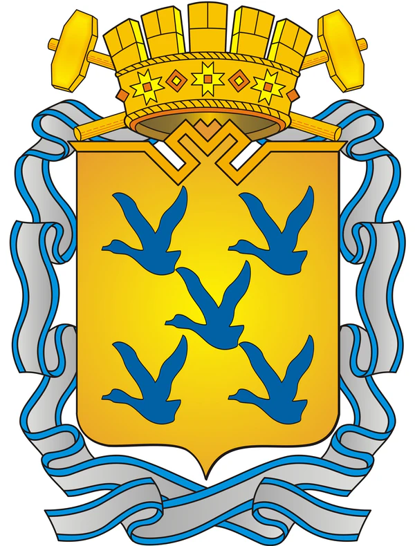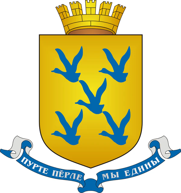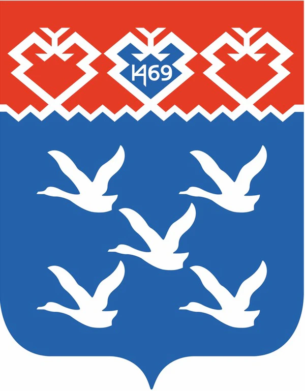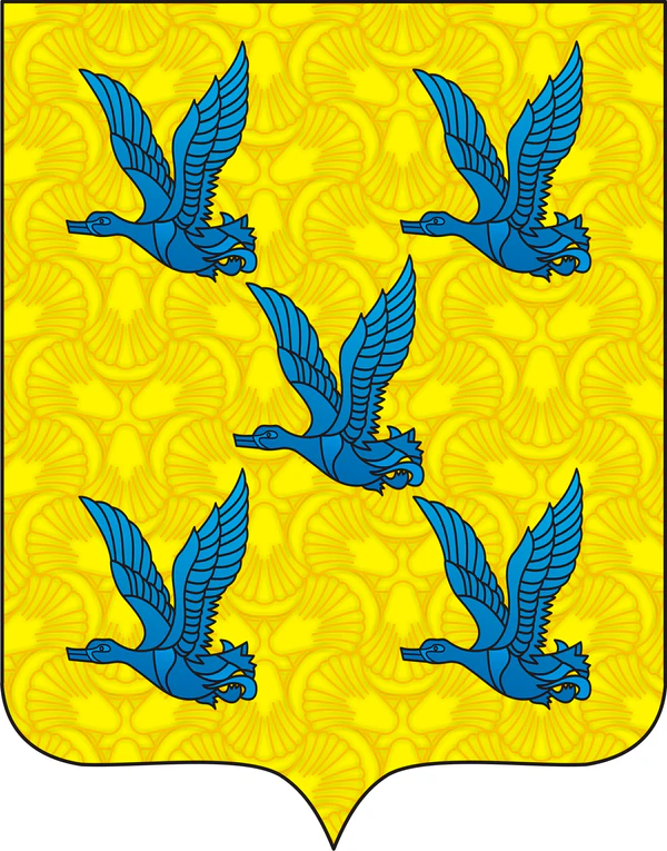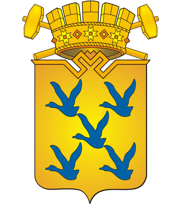 В золотом поле – пять лазоревых летящих уток: две, одна и две. Щит увенчан муниципальной короной установленного образца с обручем национального орнамента и молотами накрест.