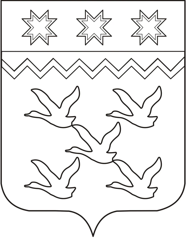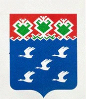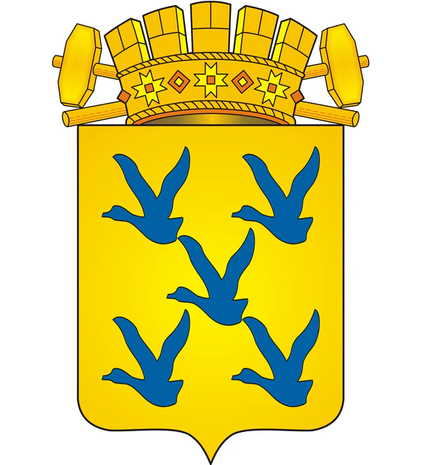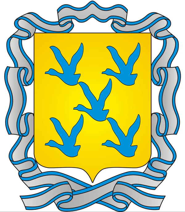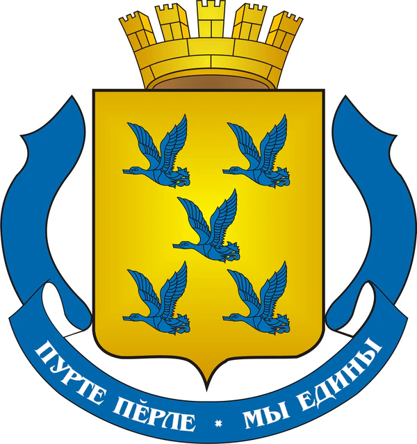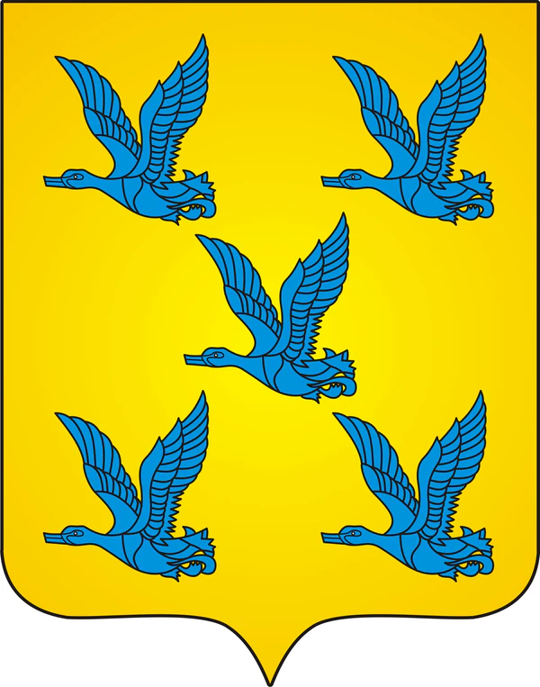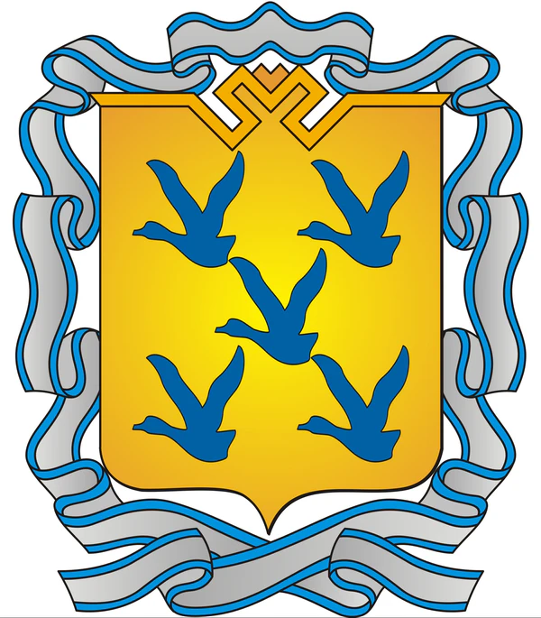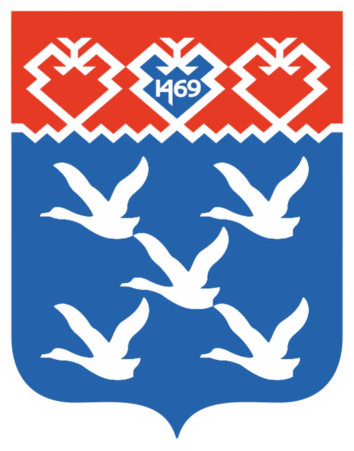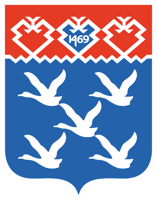 В золотом поле – пять лазоревых летящих уток: две, одна и две. Щит увенчан муниципальной короной установленного образца с обручем национального орнамента и молотами накрест.