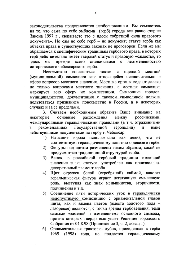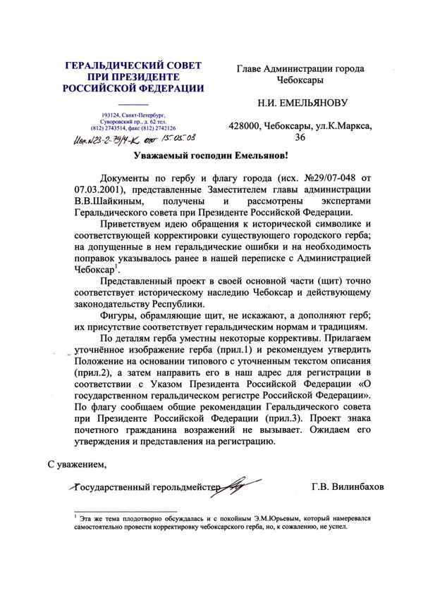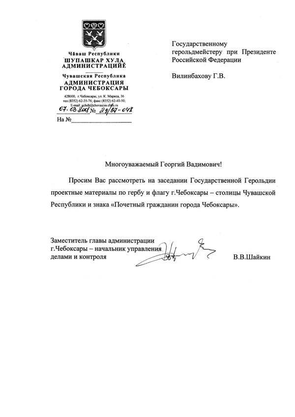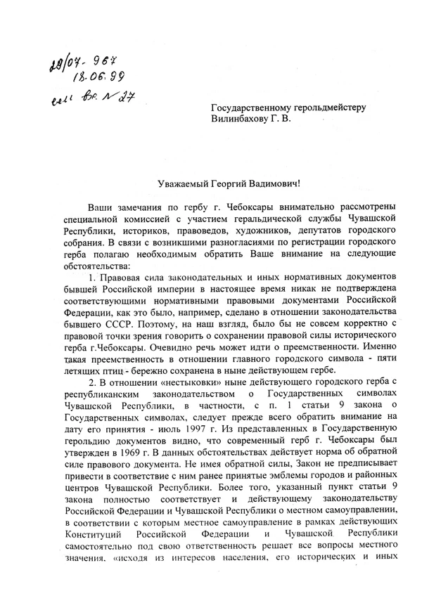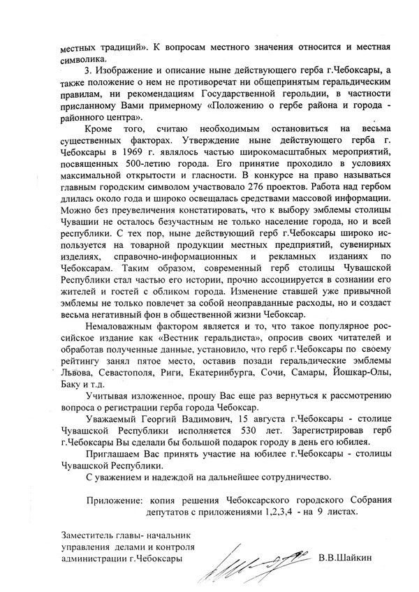 26 декабря 1998 года председатель Государственной герольдии при Президенте Российской Федерации Георгий Вадимович Вилинбахов направил в администрацию города Чебоксары обращение по действующему гербу города.