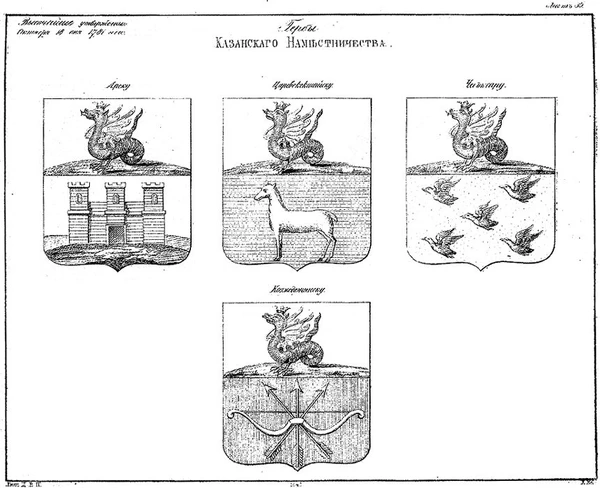 Чебоксарской. Пять летящих в золотом поле диких уток, в знак того, что в окрестностях сего города оных очень изобильно. Во означение того, что город принадлежит Казанскому наместничеству в верхней части щита добавлен герб Казанский - змий черный под короною золотою, Казанскою, крылья красные, поле белое