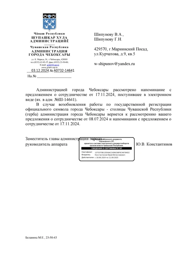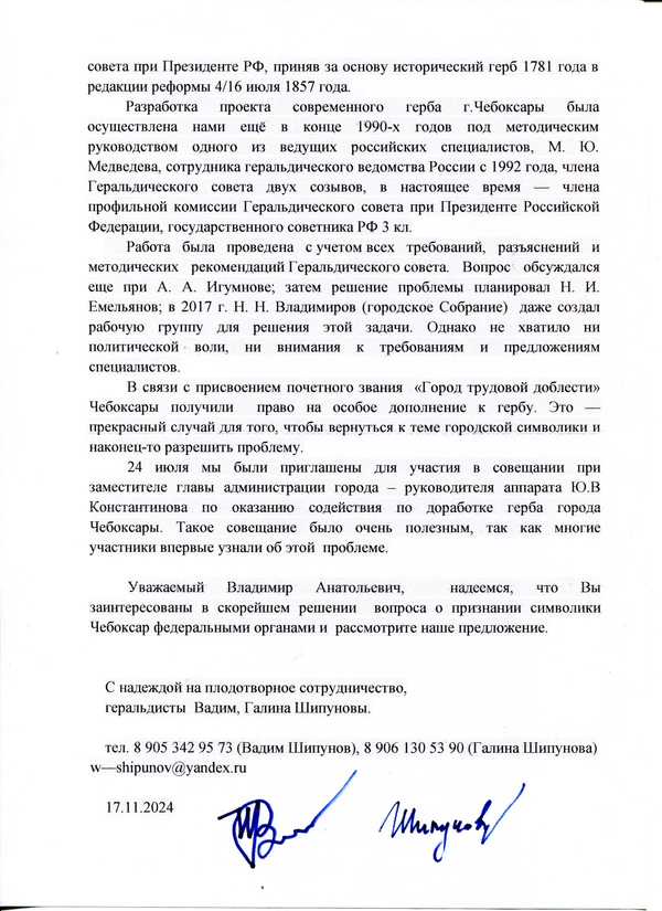17 ноября 2024 года геральдисты Вадим Анатольевич и Галина Николаевна Шипуновы направили в администрацию города Чебоксары напоминание о сотрудничестве по гербу Чебоксар.
