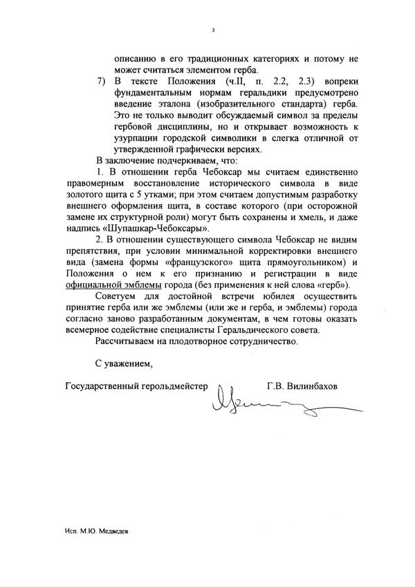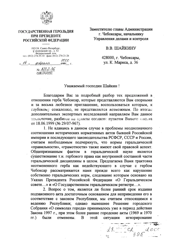 14 февраля 2000 года председатель Государственной герольдии при Президенте Российской Федерации Георгий Вадимович Вилинбахов направил в администрацию города Чебоксары экспертное заключение по действующему гербу города.