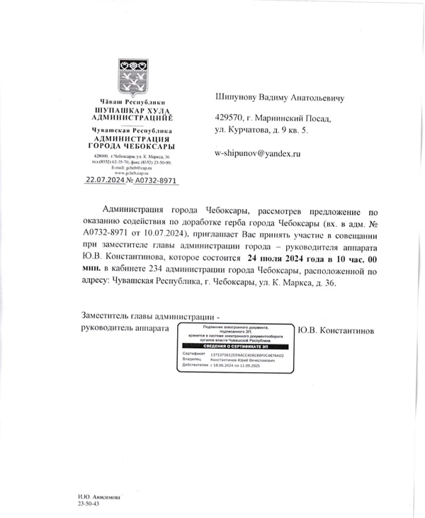 22 июля 2024 года администрация города Чебоксары отправила ответное письмо с приглашением на совещание администрации.