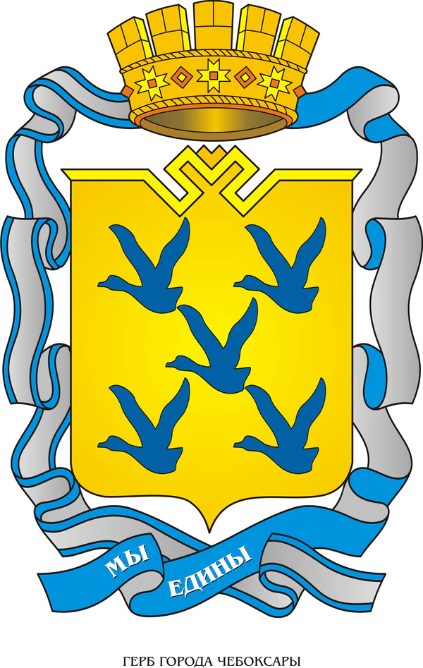 Герб города Чебоксары представляет собой серебряный пересеченный щит французской формы, разделенный на главу и основание. На лазоревом поле основания изображены фигуры летящих конвертом «Пяти серебряных уток». В червленном поле главы, отделенном от основания зигзагообразной линией (в чувашской орнаментике - изображение реки, в данном случае реки Волга), три серебряных, стилизованных под чувашский орнамент силуэта дубов. Внутреннее поле двух крайних дубов червленное, поле среднего силуэта - лазоревое, с серебряными цифрами «1469» (дата первого летописного упоминания Чебоксар)[5].