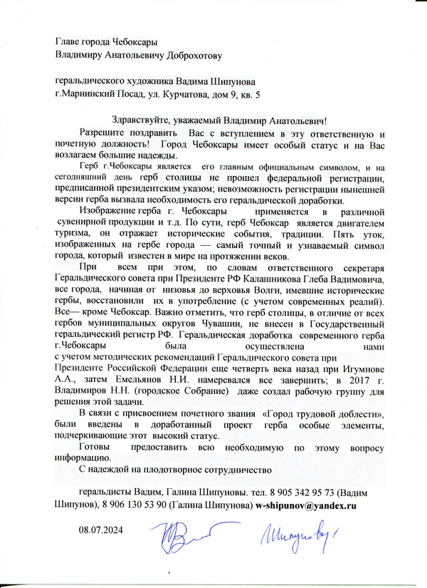 8 июля 2024 года геральдисты Вадим Анатольевич и Галина Николаевна Шипуновы направили в администрацию города Чебоксары обращение по гербу Чебоксар.