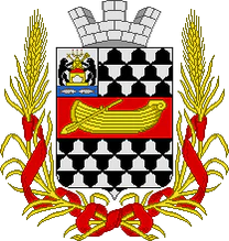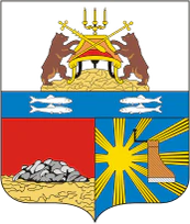 Герб городу Высочайше пожалован 29 марта 1811 года Императором Александром I: «В верхней, серебряной, половине щита — герб Новгородский; в нижней половине, в правом красном поле, видна каменная гора, а в левом, голубом поле, изображены солнечные лучи и руль»[2].