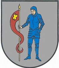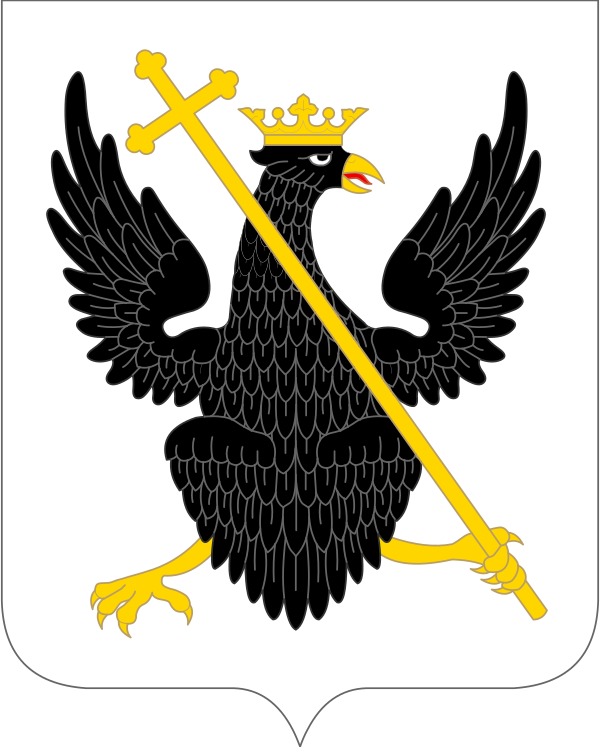 В серебряном поле чёрный с золотым клювом и когтями и червлёными глазами и языком коронованный золотом орёл, держащий в левой лапе длинный золотой крест в перевязь.