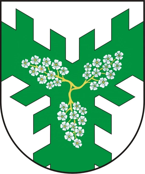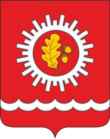 В червленом поле над серебряным узким выщербленным поясом серебряное же зубчатое кольцо (с чередованием коротких и длинных зубцов), в котором – золотой дубовый лист, из-за которого слева вырастают два золотых же жёлудя.