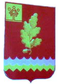 В червлёном поле с выщербленной лазоревой оконечностью золотое зубчатое кольцо с зубцами, сужающимися в вершинах, и внутри его серебряный безант, обремененный зеленым дубовым листом с двумя золотыми желудями, оттененными золотом.