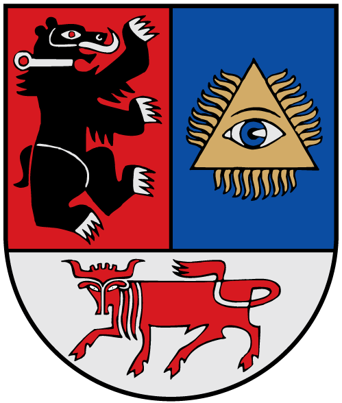 Щит большого герба разделён на три поля. В переднем червлёном поле чёрный обращённый медведь с серебряным языком, когтями и цепью того же цвета на шее. В заднем лазурном — лучистый золотой глаз Божьего Провидения. В серебряной оконечности щита червлёный телец. Над щитом пурпурная княжеская шапка с золотыми дугами, усаженными серебряными перлами, и золотой державой наверху. Бока щита украшают две, связанные внизу червлёной лентой, зелёные лавровые ветви с червлёными ягодами.