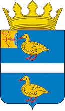 В лазоревом поле серебряный пояс, сопровождаемый вверху и внизу золотыми утками с червлёными глазами, клювами и лапами.
