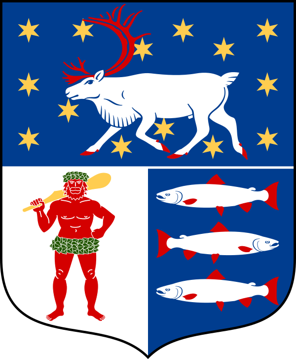 Щит пересечён и полурассечён, в первом усыпанном золотыми шестилучевыми звёздами лазоревом поле бежит серебряный северный олень с червлёными рогами и копытами, во втором серебряном — червлёный дикарь с зелёными берёзовыми венками на голове и бёдрах держит правой рукой опёртую на плечо золотую дубину, в третьем лазоревом — три серебряных лосося с червлёными плавниками и хвостами, друг над другом, средний повернут влево, два других — вправо.
