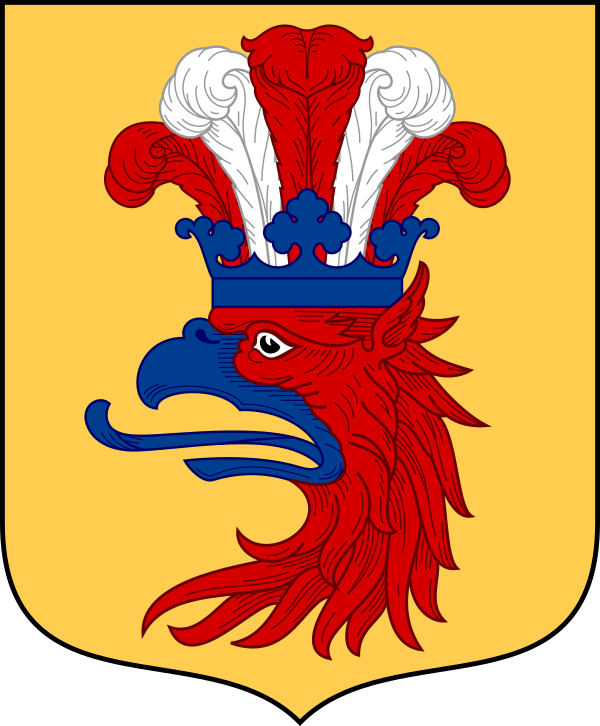 В червлёном поле оторванная золотая коронованная голова грифона.