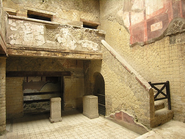 Планировка этого дома, построенного в середине I века, довольно нехарактерна для античности. Вход ведёт в вестибюль с низким сводом, с правой стороны которого расположены три небольшие комнаты. Далее следует помещение внутреннего дворика, в честь которого назван дом. Оттуда можно подняться по лестнице на балкон с тремя входами в комнаты второго этажа. Эта лестница очень напоминает лестницы периода итальянского Средневековья[14].
