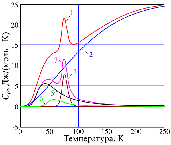 Теплоёмкость германия имеет аномальный вид, а именно, содержит пик над уровнем нормальной (колебательной) составляющей[30][31], который, как пишет Ф. Зейтц: «не может быть объяснён никакой теорией, предполагающей гуковский закон сил, ибо никакая суперпозиция эйнштейновских функций не даёт кривой с максимумом»[32] и объясняется, как и аномальность поведения теплоёмкостей гафния, алмаза и графита, больцмановским фактором, контролирующим диффузионную (диссоциационную) компоненту[33].