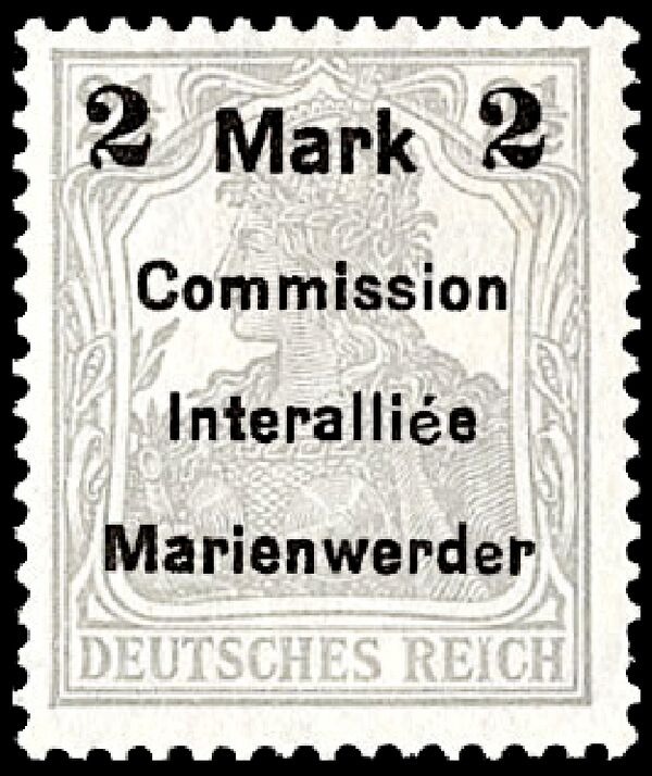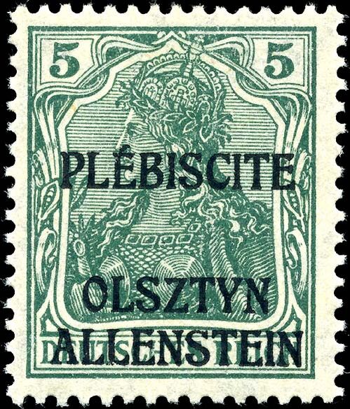 - август 1921 года — высокие номиналы образца 1920 года с изображением Германии надпечатаны — 1,60, 3, 5 и 10 немецких марок.