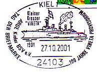 Тогдашние почтовые правила дозволяли в подобных экстренных случаях оплату наличными. Но капитан «Винеты» принял иное решение: он с разрешения верховного казначея морского флота Германской империи разрезал пополам по вертикали 300 почтовых марок номиналом в 5 пфеннигов, изготовил специальный штемпель и на каждой половинке пятипфенниговой марки фиолетовыми чернилами напечатал «3PF», после чего проблема на судне была решена. Первые газеты, письма и открытки от моряков «Винеты», погашенные штемпелем Германской корабельной почты морского флота № 1, отправились на родину 17 апреля 1901 года по прибытии корабля в Пернамбуку (Бразилия) и стали достигать адресатов уже начиная с 6 мая. 28 июня 1901 года на крейсер поступил приказ из Берлина прекратить такое франкирование. Однако почтовые отправления продолжали франкироваться половинками до конца августа. Известно, также, несколько случаев использования членами экипажа «Винеты» сразу двух надпечатанных трёхпфенниговых половинок зелёной пятипфенниговой марки для предварительной почтовой оплаты писем. Неизвестно, из каких побуждений они это делали, однако несомненно, что при франкировке они переплатили 1 пфенниг.