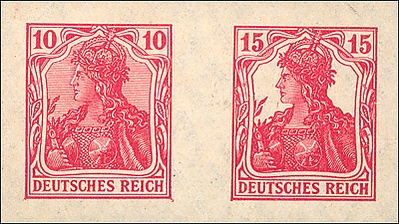- август 1916 года — к серии добавлены марки дробных номиналов 2½ (серая), 7½ (оранжевая) и 15 (коричневая) пфеннигов. Фигура Германии впервые на светлом фоне.
