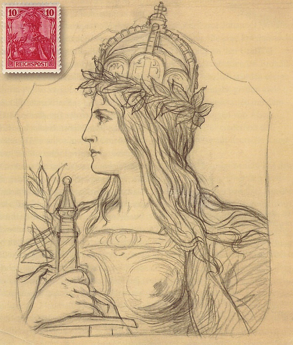 Второй по важности задачей рейхспочты было создание почтовых марок, резко отличавшихся по своему внешнему виду как от местных выпусков германских государств, так и от прежних общеимперских стандартных серий — с крупными цифрами номиналов (1872—1874) и «орлиной» (1875—1889). Кроме того непременным требованием к новым почтовым маркам было и решение сугубо технических проблем — в частности, максимальное затруднение возможных подделок, а одним из лучших способов обезопасить марки от подделывания является изображение человека. Сочетание перечисленного и дало на выходе принятие аллегорической фигуры Германии как сюжета.