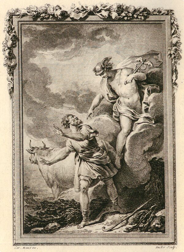 Аполлон, обнаружив пропажу, начал поиски. Расспросив местных жителей, один из которых видел мальчика с хлыстом, угоняющего коров, а также благодаря знакомому не понаслышке Аполлону искусству прорицания он узнал о личности похитителя. Придя в пещеру, где лежал в колыбели Гермес, Аполлон потребовал вернуть ему коров. Мальчик стал отпираться, указывая на свой возраст. Тогда Аполлон взял Гермеса в пелёнках и понёс на Олимп к их общему отцу Зевсу. Ситуация позабавила верховного бога. По указанию отца Гермес был вынужден отвести Аполлона к месту, куда он загнал и спрятал коров. По пути Гермес начал играть на сконструированной им из панциря черепахи лире. Игра на музыкальном инструменте настолько поразила Аполлона, что в обмен на неё он отдал Гермесу своё стадо[115][116].