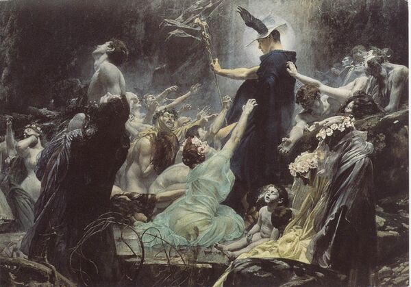 В представлении древних греков душа человека после смерти в виде некой воздушной субстанции отделялась от тела. Роль проводника душ мёртвых (др.-греч. Ψυχοπομπός — Психопомп) была отведена Гермесу. Первая литературная фиксация этой функции вестника богов содержится в «Одиссее» Гомера[64]. Данное представление о Гермесе как сопровождающей душу до царства мёртвых божественной силе нашло развитие у пифагорейцев. В сочинениях Плутарха содержится указание на то, что через 30 дней после смерти человека его родственникам следует принести жертвы Гермесу, так как он «так же принимает души умерших, как земля — их тела»[65][66].
