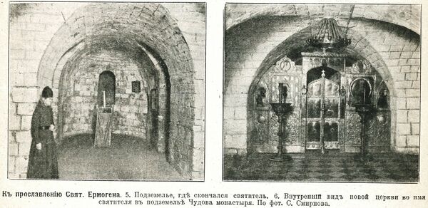 Первый храм в честь нового святого был освящён митрополитом Макарием (Невским) 13 (26) мая 1913 года — устроен Русским монархическим собранием и Русским монархическим союзом в подземелье Чудова монастыря[27][29].