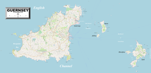 Гернси — второй по величине (после Джерси) среди Нормандских островов, имеет площадь 63 км2. Находится в 48 км к западу от Нормандии (Франция) и имеет форму прямоугольного треугольника со срезанными острыми углами. В состав коронного владения (бейливика) Гернси, кроме этого острова, входят острова Олдерни, Сарк, Джету, Херм, Лику, Бреку, Бруху, Каскетс, Ортак, Кревишон, Уме, а также несколько мелких необитаемых островов[9][2].