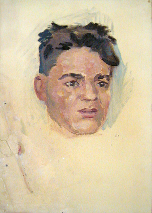 Композиция построена в верхней части листа, где изображена голова юноши в трёхчетвертном повороте. Лицо отличается розовым оттенком и выраженными скулами. Чёрные волосы небрежно спадают на лоб справа, брови и широко расставленные глаза также чёрного цвета. Нос небольшой, верхняя губа резко очерчена, подбородок тяжёлый. Справа присутствует серый фон, остальная поверхность картона остаётся белой, что подчёркивает особенности цветовой гаммы работы.