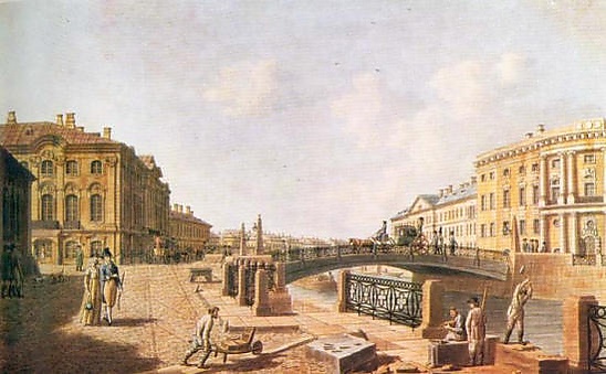 В 1805—1806 годах Гесте строит пешеходный чугунный Бердов мост через реку Пряжку, используя предложение конструкции моста Р. Фултона, опубликованное в Лондоне в 1796 году[4]. Хрупкость чугуна наряду с невозможностью восприятия растягивающих усилий определили арку как конструктивную форму пролётного строения, для того, чтобы промышленно производить унифицированные части пролётного строения мостовых конструкций, арочный свод был разбит на отдельные составляющие элементы. После успешной проверки идей и технологий, инженер применил тот же метод при обновлении переправ через Мойку.