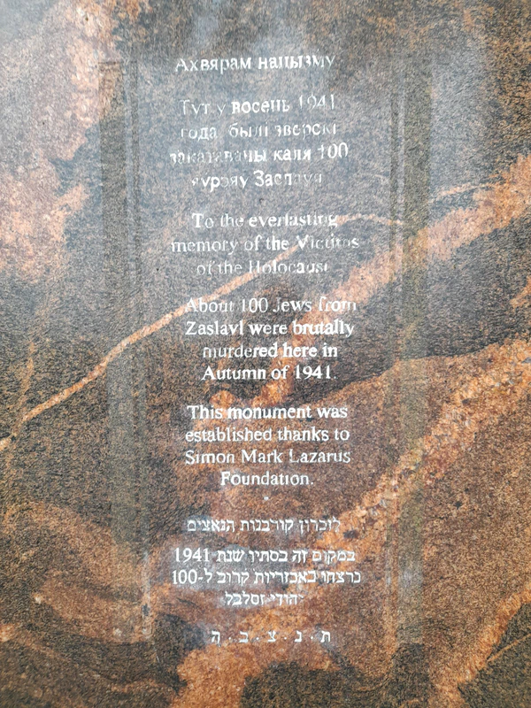 29 октября 1941 года всем евреям из гетто (около 150 человек) приказали погрузиться на гужевые повозки якобы для переселения в Минск. Всех их вывезли из Заславля и расстреляли в лесу у заранее вырытой ямы[5][1].