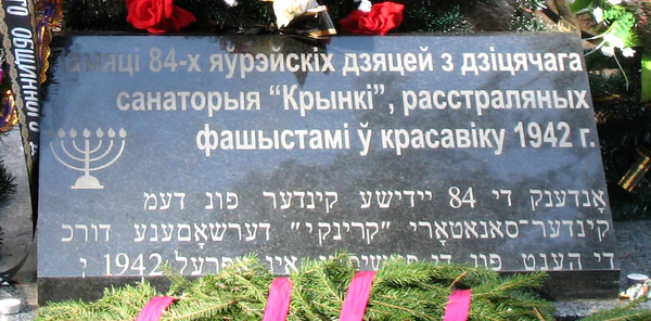- Выживший узник — Владимир Семёнович Свердлов — нашёл в лесу место убийства еврейских детей из санатория «Крынки» и на свои деньги при содействии властей Осиповичского района и Дарановского сельского совета, 27 октября 2006 года поставил на этом месте новый памятник вместо установленного в 1960-е годы и сильно обветшавшего — в урочище Галны возле деревни Крынка[4]. Памятник называют «Детским камнем». На камне надписи по-белорусски и на идиш: «Памяти 84 еврейских детей из детского санатория „Крынки“, расстрелянных фашистами в апреле 1942 года»[1][2].