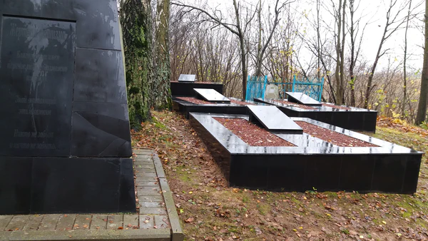 - В 1955 году в ответ на постоянные требования фронтовиков — родственников убитых евреев, власти перенесли останки расстрелянных шкловских и других евреев на территорию еврейского кладбища в Рыжковичах в несколько братских могил. Там был установлен памятник жертвам геноцида евреев с надписью: «Жертвам фашизма. Благородных имён перечислить невозможно. Их много. Знай, внимающий этим камням. Но никто не забыт и ничто не забыто». Главным инициатором и организатором перезахоронения был Калмыков, вернувшийся из эвакуации. Само это кладбище во время войны было полностью уничтожено, могилы сравняли с землёй, а могильные камни местные жители забрали для личных нужд[4].