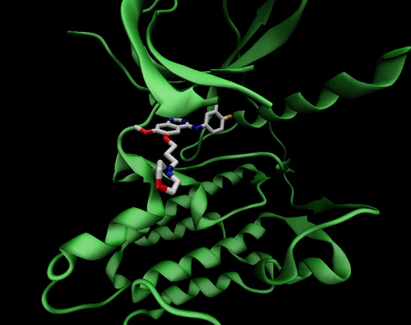 Гефитиниб конкурирует с натуральным лигандом АТФ за АТФ-связывающий сайт киназного домена, препятствуя фосфорилированию белка RAS ниже по каскаду.[3]