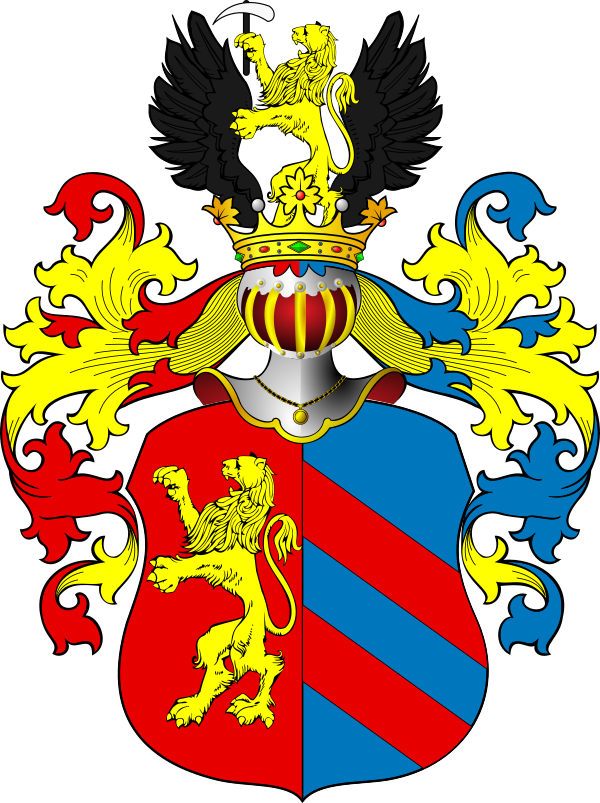 В щите напол-разделенном, в правом, красном поле — серебряный лев вправо, а в левом, голубом — две красные перевязи, наискось к левому боку.