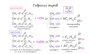 - Омыление — гидролиз жиров в щелочной среде с образованием солей карбоновых кислот (мыл) и глицерина.